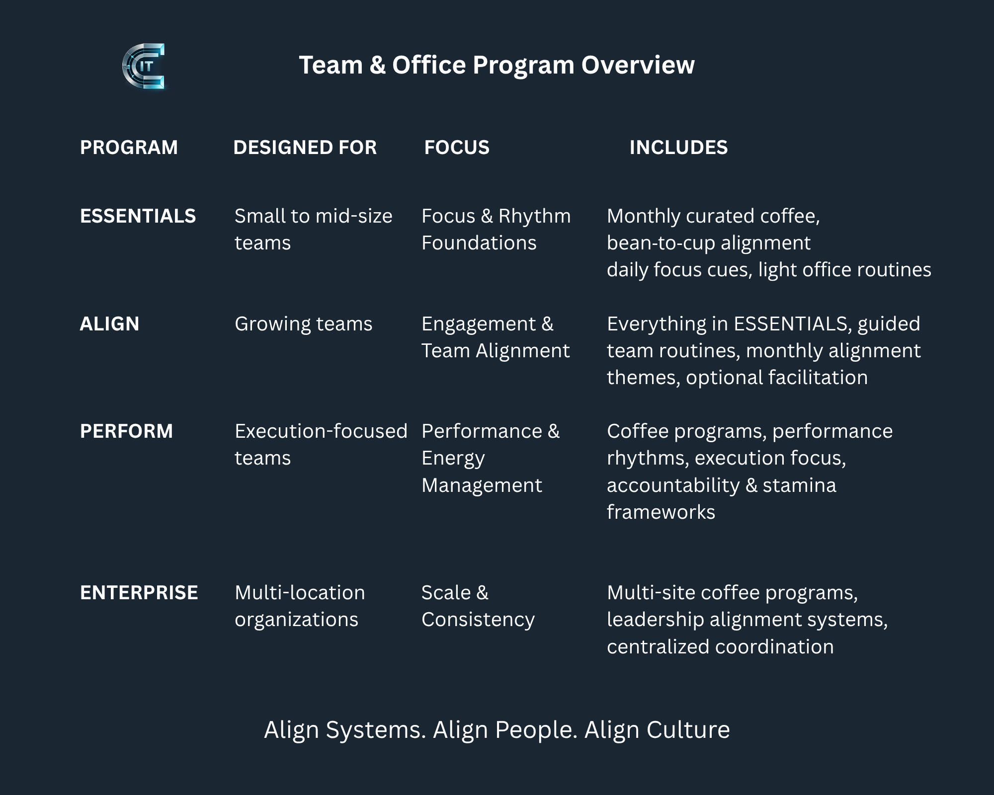 Programs are customized based on team size, coffee volume, facilitation level, and organizational structure.